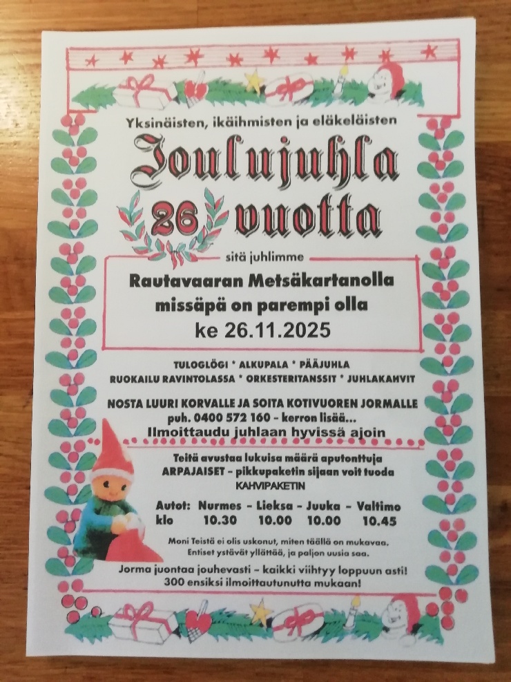 Jorma Kotivuoren ja talkoolaisten järjestämä joulujuhla tulee taas. Rautavaaran metsäkartanolla pidettävä tilaisuus on järjestyksessään jo 26.