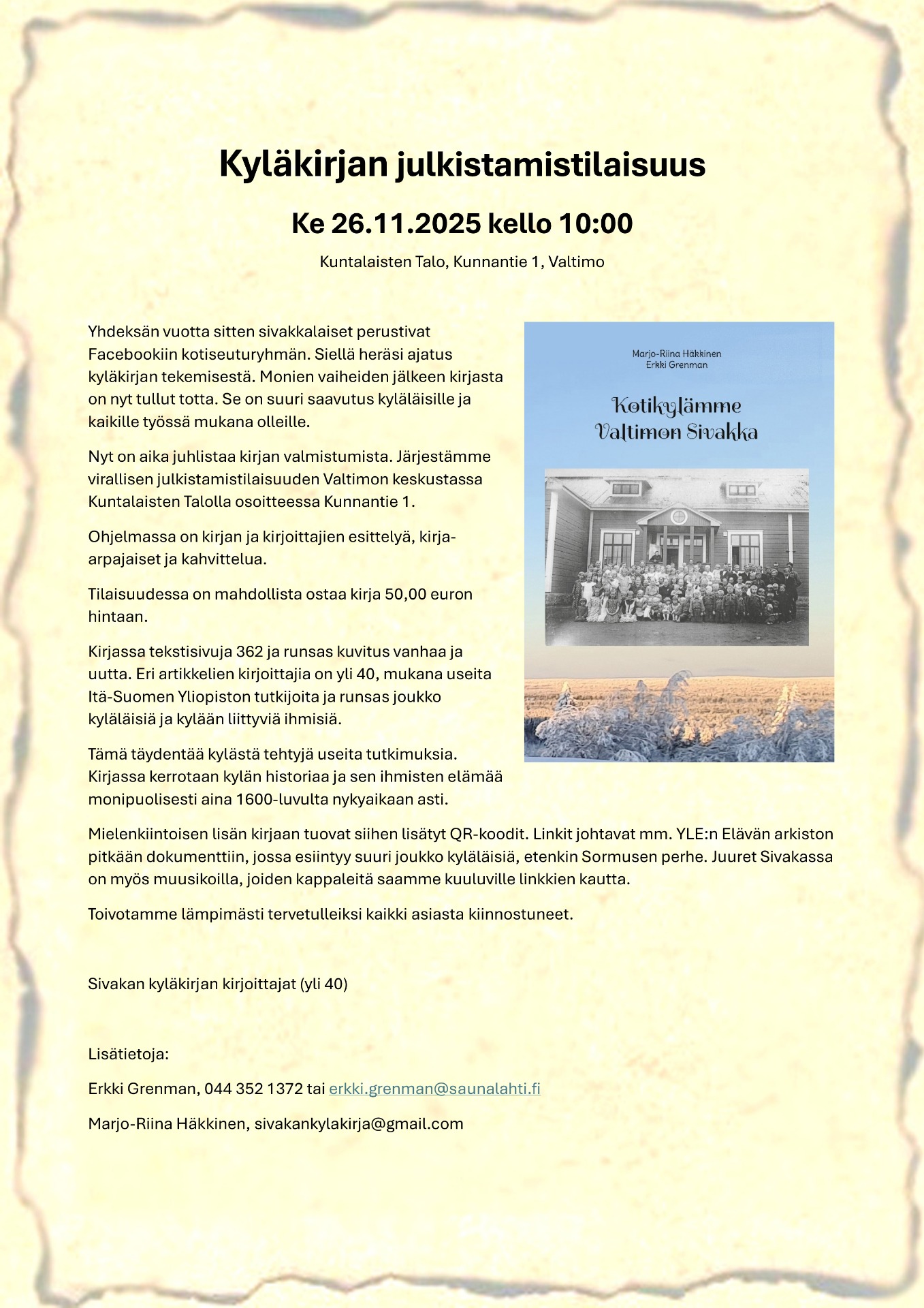 Sivakan kyläkirjan julkistamistilaisuus pidetään 26.11.2025 Valtimon Kuntalaisten Talossa Kunnantie 1, 75700 Valtimo klo 10-12. Tervetuloa!